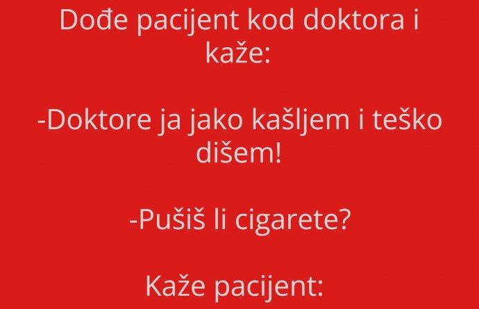 Read moreDođe pacijent kod doktora i kaže: -Doktore ja jako kašljem i teško dišem! Pušiš li cigarete? Kaže pacijent: -Pušim, ali