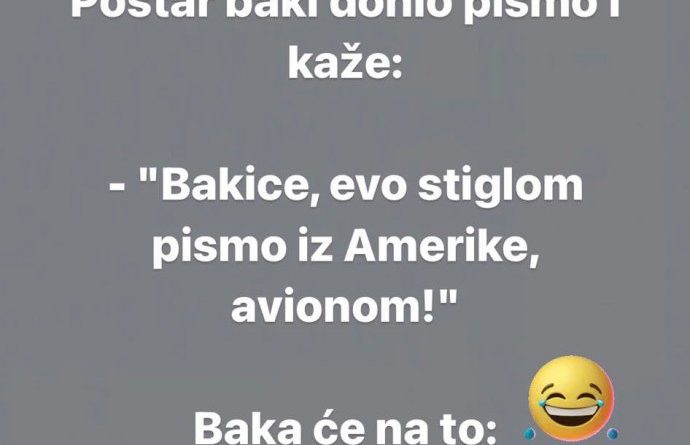 Read morePoštar baki donio pismo i kaže: – “Bakice, evo stiglom pismo iz Amerike, avionom!” Baka će na to: – “Ne laži, vidjela