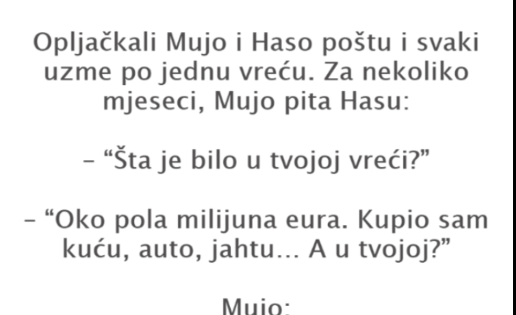 Read moreOpljačkali Mujo i Haso poštu i svaki uzme po jednu vreću. Za nekoliko mjeseci, Mujo pita Hasu: – “Šta je