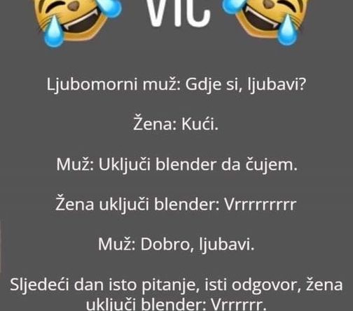 Read moreLjubomorni muž: Gdje si, ljubavi? Žena: Kući. Muž: Uključi blender da čujem. Žena uključi blender: Vrrrrrrrrr Muž: Dobro, ljubavi. Sljedeći