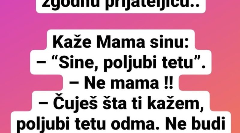 Read moreIzašla mama sa sinom napolje u šetnju i usput sretne svoju jako lepu i zgodnu prijateljicu.. Kaže Mama sinu:– “Sine,